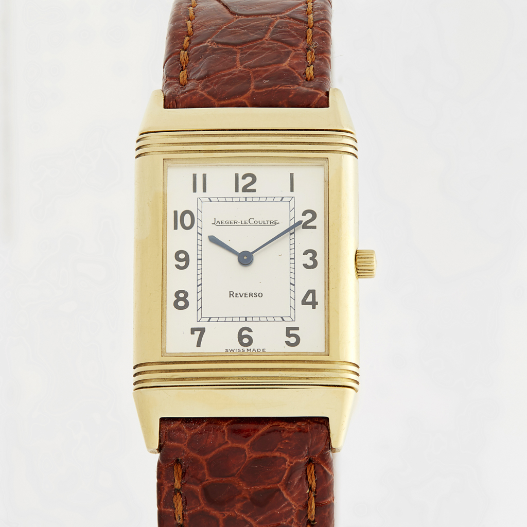 Reverso, silvered chapter ring with Arabic numerals, brushed effect centre, plain gold case, numbered to rear Ref. No. 250.1.09, serial No. 1656949, leather strap, gilt buckle, with boxes