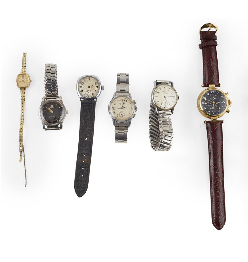 Seamaster, stainless steel cased wrist watch, black dial, gilt baton indicators and Arabic numerals, sweep second hand, automatic movement, later expanding bracelet, automatic movement, together with; NICE WATCH - a gentleman's stainless steel cased wrist watch, off white dial brushed silver effect dial, later bracelet, Arabic hour indicators, chrome case, manual movement; UN-NAMED, a stainless steel cased chronograph, off white dial, sweep second hand, subsidiary seconds and minutes elapsed, Arabic indicators, with a stainless steel Rolex bracelet, fold over clasp; another gentleman's wrist watch, A/F and a lady's Rotary wrist watch; STAUER - A gentleman's wrist watch, with day, date, month, 24 hour dial, sweep second hand, moon phase (qty)