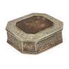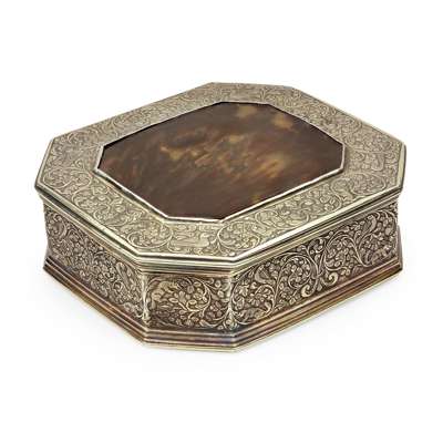 apparently unmarked, the canted rectangular box, hinged cover with inset tortoiseshell panels, the borders and frames well chased with trailing foliage and birds to the corners (2)