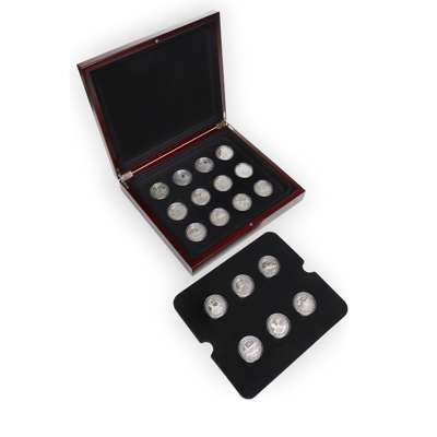 2014, collector set double cases with eight and six coins; 2012, cased set ten coins; 2013 collector set, double cases with eight and six coins; a cased set of eighteen silver crown sized coins making up The Royal Navy Silver Proof coin set (qty)