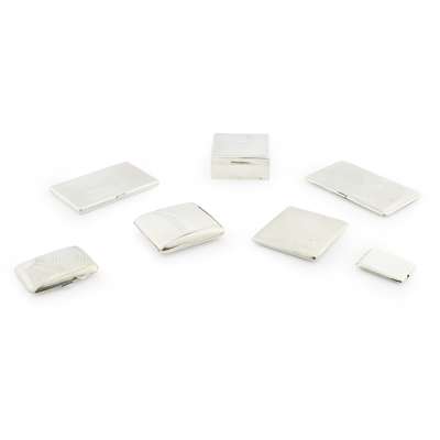 HCD, Birmingham 1960, of square form, engine turned detail and engraved italic initials to lid; together with three cigarette cases of rectangular form with engine turned detail and three smaller