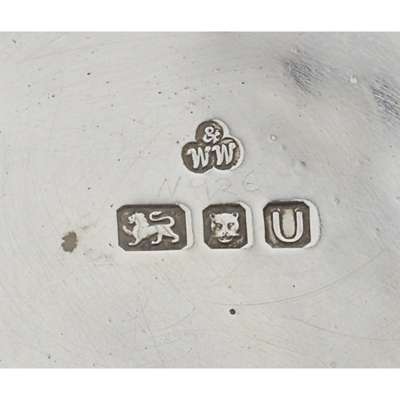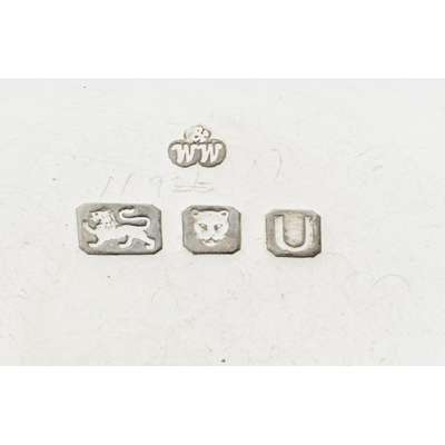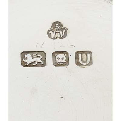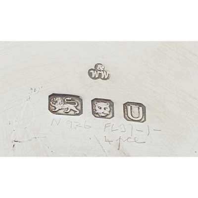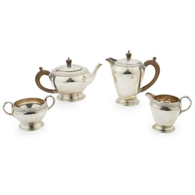 Wakely & Wheeler, London 1955, comprising teapot, water pot, twin handled sugar bowl and milk jug, all of circular form, embossed Nordic style border, C scroll handles raised on a stepped spreading foot (4)