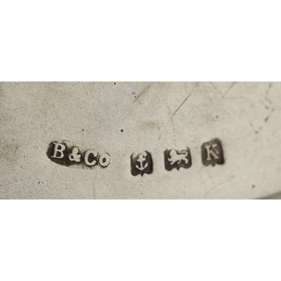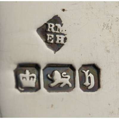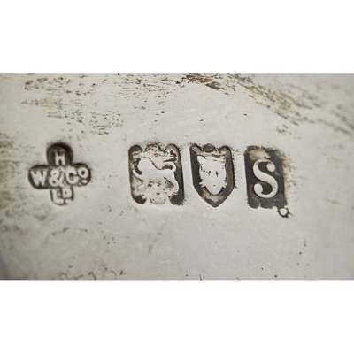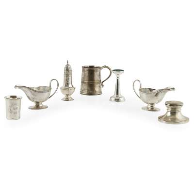 Goldsmiths & Silversmiths Co Ltd, Sheffield 1948, of conventional cylindrical form, threaded detail, crest and initials engraved to body; together with a pair of sauce boats, Horace Woodward & Co Ltd, 1913; a capstan inkwell, Birmingham; a sugar caster, Martin, Hall & Co, Sheffield; a spill vase, Mappin & Webb, Sheffield (loaded) and a continental beaker (qty)