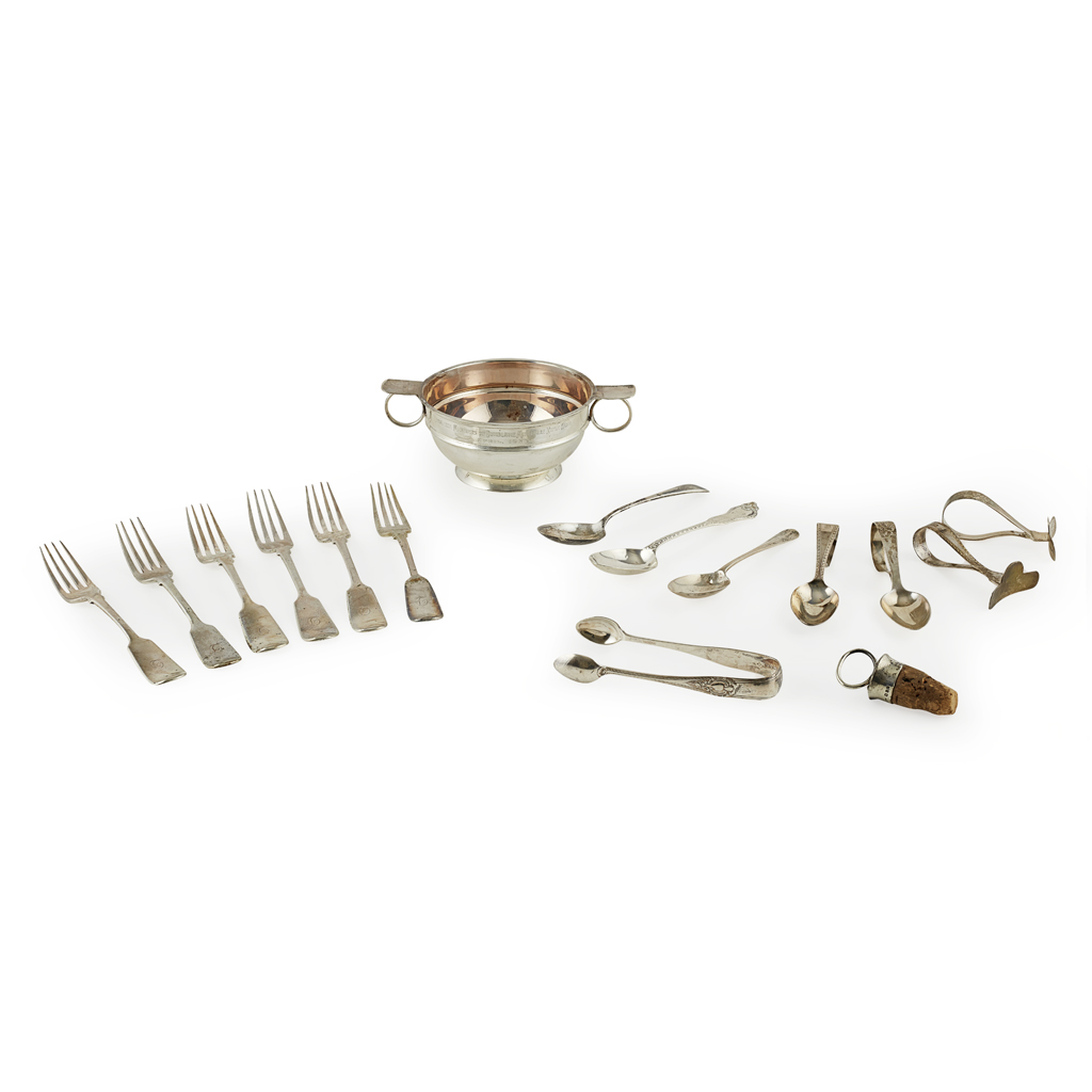Goldsmiths & Silversmiths Co Ltd, London 1931, of tapering form, angular handle, threaded border to stepped domed lid, raised on a pedestal foot; together with a George III bachelor's teapot, London, (rubbed) a twin handled porringer, Birmingham, engraving to front, a collection of six dessert forks, of Fiddle pattern, a silver mounted bottle stopper and a collection of spoons (qty)
