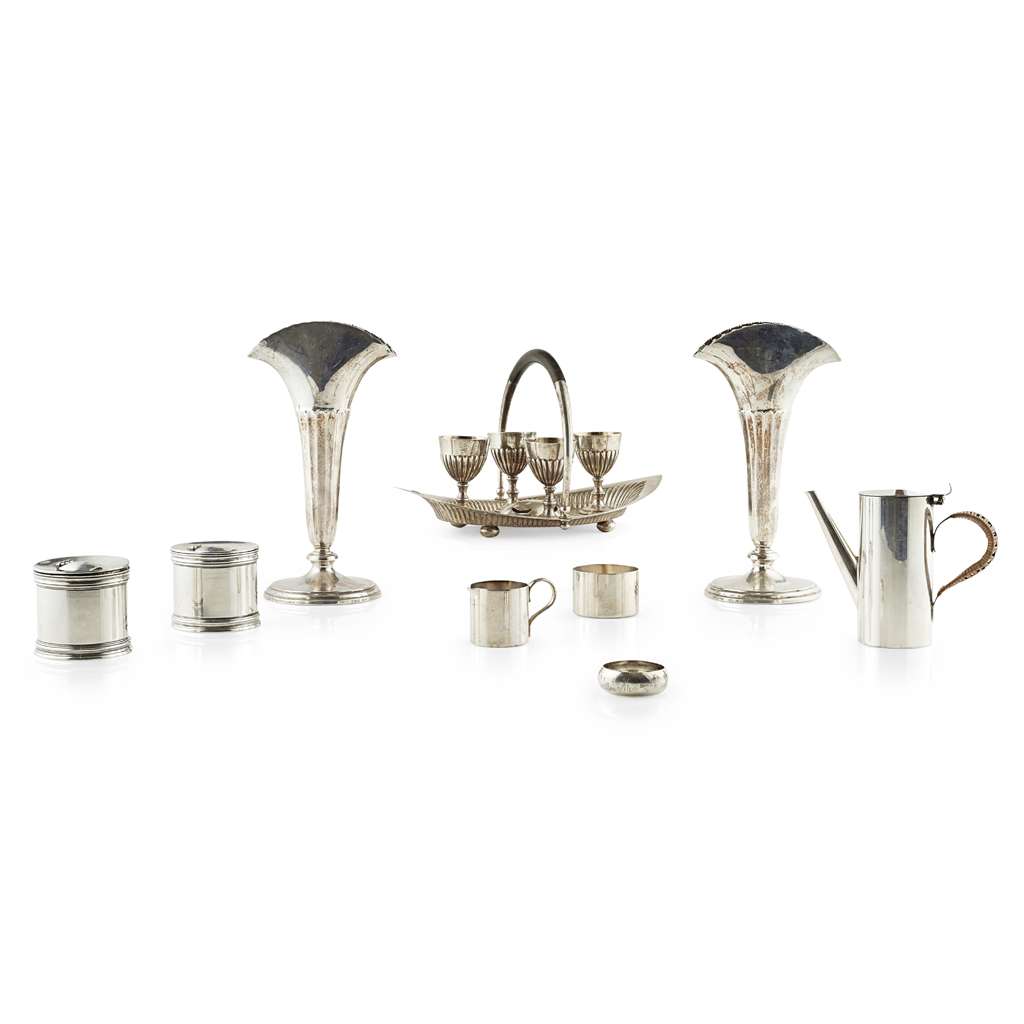 to include; a pair of spill vases Elkington & Co Ltd, Sheffield 1912, modelled as venus fly trap plants; together with a pair of inkwells, R & W Sorley, Glasgow 1901, of circular form with glass liners, an egg epergne, Elkington & Co Ltd, Birmingham 1892, a napkin ring and a small plated coffee pot, milk jug and sugar bowl (qty)
