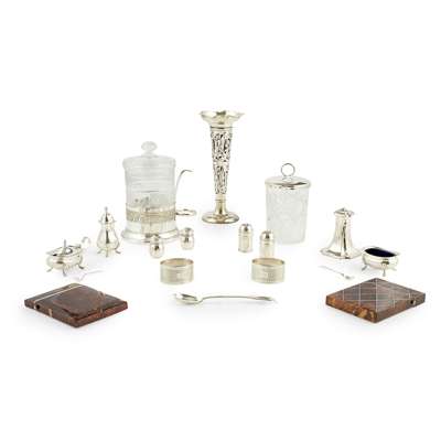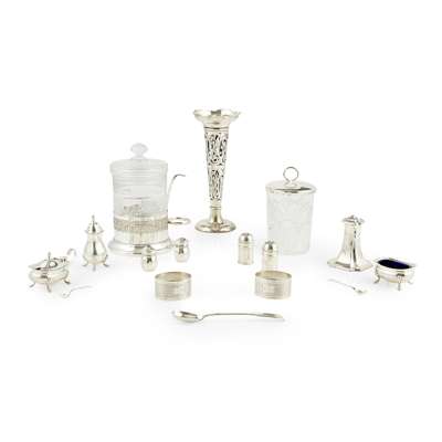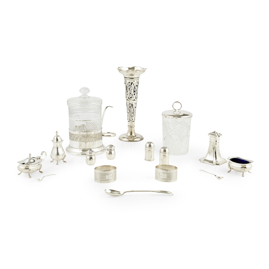 to include, a spill vase, W.A., Birmingham 1910, of pierced open form, a silver lidded glass jam jar, Lee & Wigfull, Sheffield 1904, two napkin rings Birmingham, a glass jar with plated mount; together with a collection of condiment and two tortoiseshell card cases (qty)