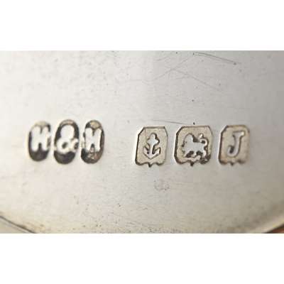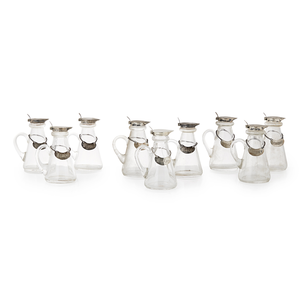 Hukin & Heath Ltd, Birmingham, various dates, each with glass body, of typical form, with star cut base, plain flat hinged cover and thumb-piece; all with matched spirit labels inscribed WHISKY
