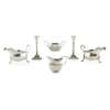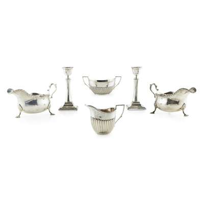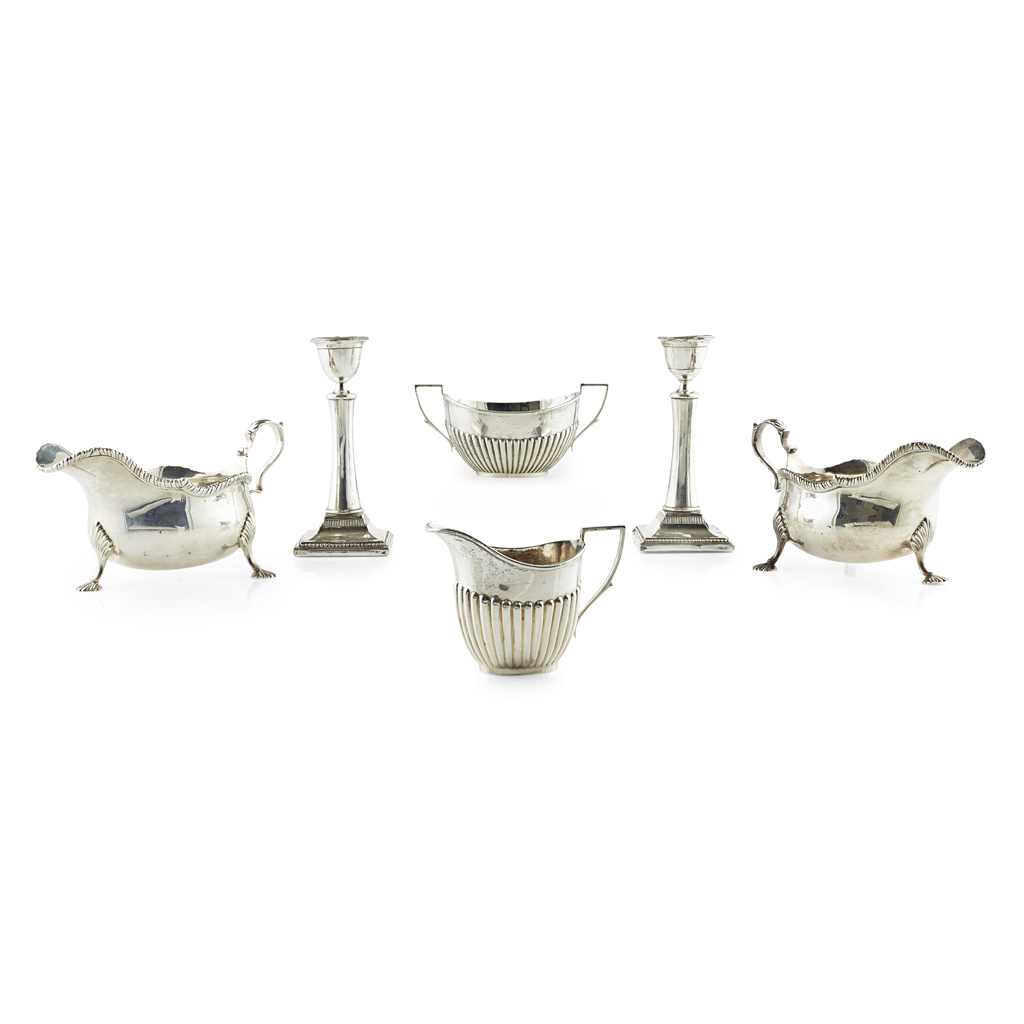 Thomas Bradbury & Sons Ltd, Sheffield 1908, of traditional form, shaped gadroon border, leaf clasped S scroll handles, raised on three shell and hoof feet; together with a pair of candlesticks, Sheffield 1910, of tapered Corinthian form (loaded), a milk jug and twin handled sugar basin, G.H. Sheffield, of oval form, demi-fluted body, angular handles (6)