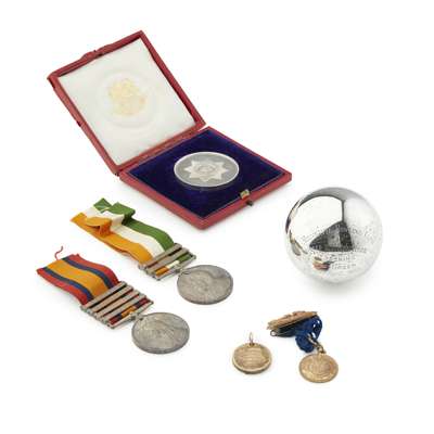 QSA with bars Belmont, Modder River, Briefontein, Belfast, KSA with bars South Africa 1901, South Africa 1902, also a cased silver medal for Athletics together with silver jack (4)