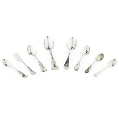 to include; six tablespoons, Glasgow 1829, King's pattern; twelve dessert spoons, five tablespoons, JM & S Glasgow of Old English pattern; together with a collection of flatware primarily Glasgow and Edinburgh