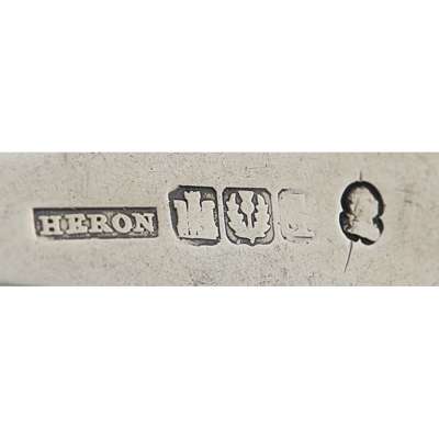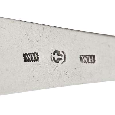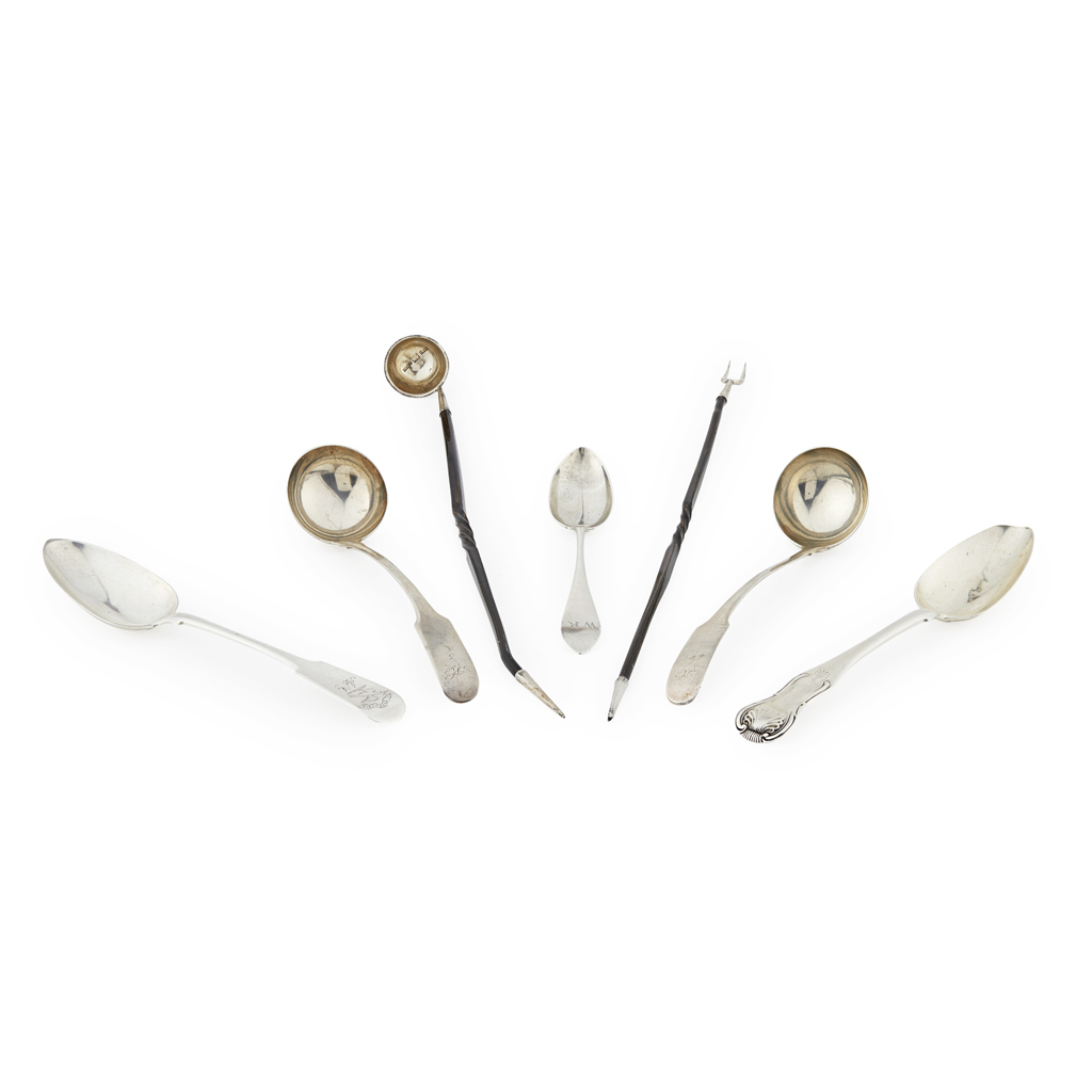 to include; a Scottish provincial pickle ladle and fork Inverness, Fraser, Ferguson & MacBean, marked to ladle bowl FF&M, camel, INVSS, each with twisted baleen handle and pointed finial; together with a dessert spoon by William Simpson of Banff, marked WS, e, thistle, B of Fiddle pattern; a teaspoon by W Hannay of Paisley, marked WH, anchor, WH, of Celtic Point pattern; a dessert spoon by J Heron of Greenock with part Edinburgh marks, single struck of King's pattern and two Edinburgh toddy ladles, fiddle pattern, numbered and initials (7)
