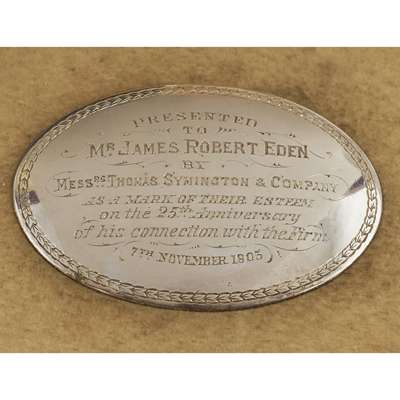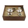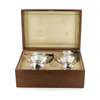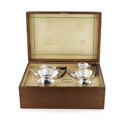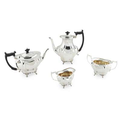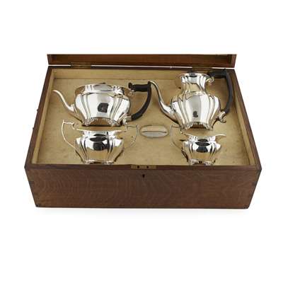 TB, London 1898, comprising; a teapot, a coffee pot, sugar and cream jug, of oval form, incurved corners, cast apron and scrolling feet, all in a fitted oak case with applied engraved silver plaque to the interior