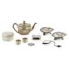 to include a pair of bon-bon dishes, Mappin Brothers, London 1893, of heart shape with pierced border; together with a bachelor's teapot Hamilton & Inches, Edinburgh 1888, of oval form, bright cut engraving borders, a cased set of two napkin rings, a matchbox an Oriental circular box, a Morayshire Farmer club medal celebrating their centenary in 1889 (qty)