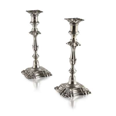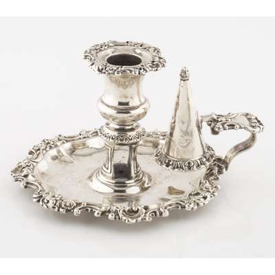Elkington & Co Ltd, Birmingham 1891, with knopped baluster and shaped stem, onto a spreading foot, shell decorated border; with engraved monogram to base of stem together with a George IV chamber stick and snuffer, S C Younge & Co, Sheffield, 1826, the rounded base with moulded border, the removable sconce with similar decoration, conical snuffer, engraved gothic H to dish (3)