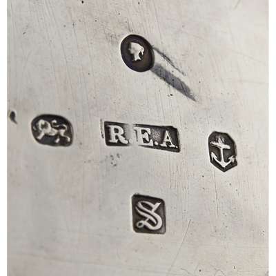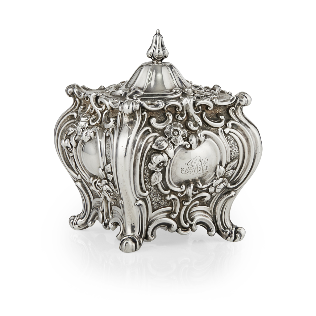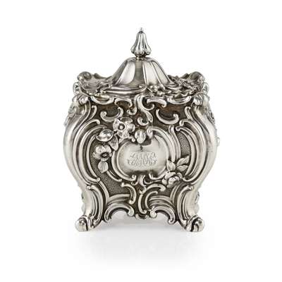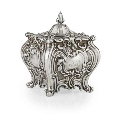 Robinson, Edkins & Aston, Birmingham 1841, of bombe form with scroll details to corners, with four flower head cartouches, initials engraved to cartouche, raised on four bracket feet