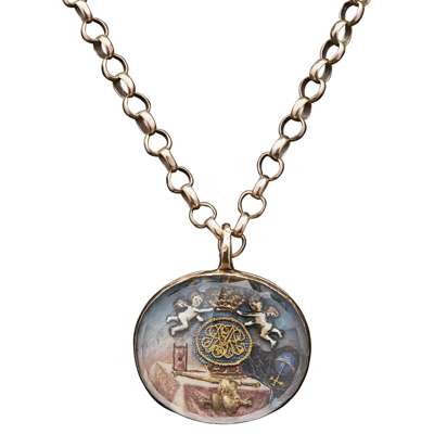 of oval form, simple gold mount, the facetted crystal enclosing a bullion wire work monogram with a pair of flying cupids in white holding a crown, other symbols include an anchor, hour glass, sceptre, heart pierced with an arrow, all symbols of mortality and earthly power, the rear with plaited hair, later gold chain