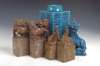 19.5cm high; a pair of Chinese carved soapstone Dogs of Fo, on incised block plinths, 19.5cm high; and another pair with figures (one damaged) (5)