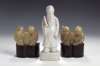 on wave decorated oval plinth, 22cm high; and a pair of carved jade groups, each of two figures clasping a barrel, on ebonised plinths, 8cm high excluding stand (3)