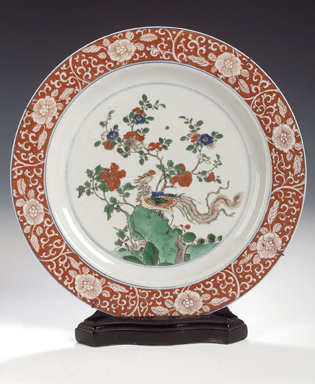 with central panel in the kakiemon palette, depicting a phoenix, the border with continuous rouge de fer flower head decoration, 27cm diameter; another similar, with flower and fence decoration (riveted), 6.5cm diameter; and a famille rose plate, with a phoenix, 23cm diameter (3)