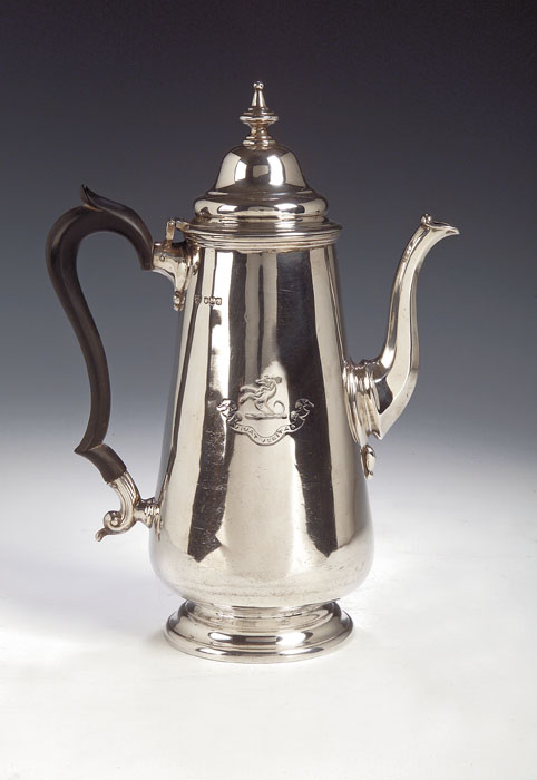 with marks for Goldsmiths & Silversmiths Company, Sheffield, 1918, of plain baluster form, the domed lid with pointed finial, scrolled wooden handle and octagonal spout, engraved with the Duncan crest, on spreading circular foot