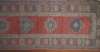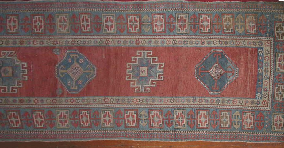 the red field with five blue medallions, within blue geometric pattern border between bands