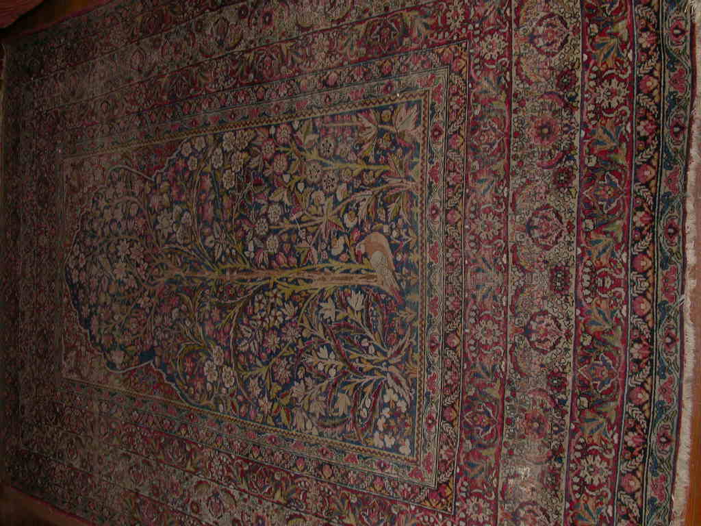 the blue mihrab with floral tree of life pattern, red spandrels, within cream palmette and rosette border between similar smaller red borders and various bands