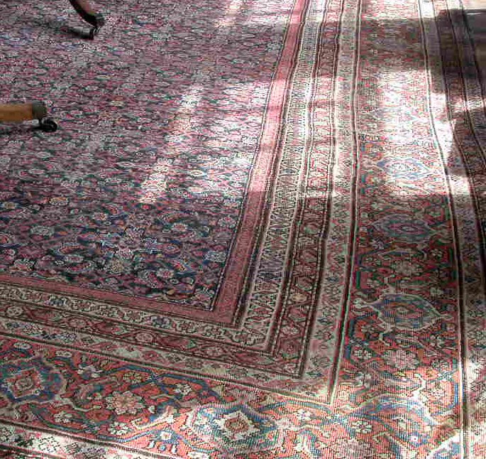 the indigo field with allover herati pattern, within red turtle palmette and scrolling vine border between various bands