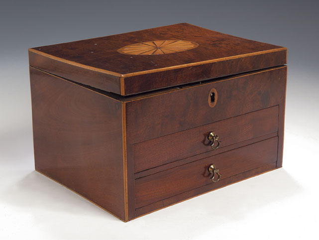 with boxwood strung edges, the hinged rectangular top with central oval batswing paterae, above two drawers
