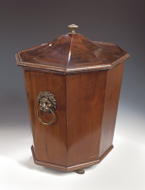 of Adam style, the domed lid with brass finial, the tapering body with lion’s head mask handles, on toupie feet