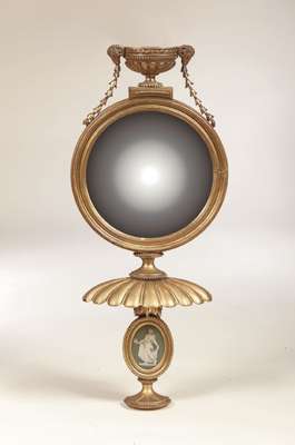 of Adam style, the circular mirror plate in moulded frame surmounted by gadrooned urn with ram’s heads suspending harebell chains, the lower section with spreading gadrooned canopy above green jasperware Wedgwood style plaque with figure, on semi-circular base
