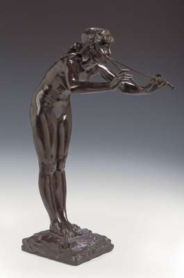 the naked female figure leaning forward and playing on two pipes, on naturalistically modelled rectangular base with snake rising from it, signed ‘Beguine’, with impressed marks ‘Soit-Decauville, Fondeur Paris’ and ‘6941’ (damage to one horn)