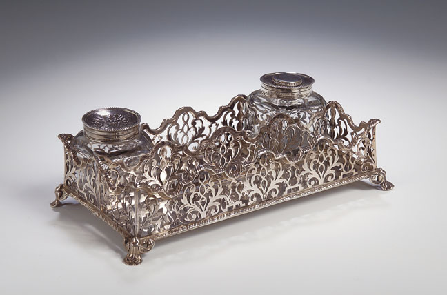 with marks for ‘EA’, London, 1848, of rectangular form, with pierced scrolled gallery and divisions containing two silver mounted glass jars, on four scrolled feet