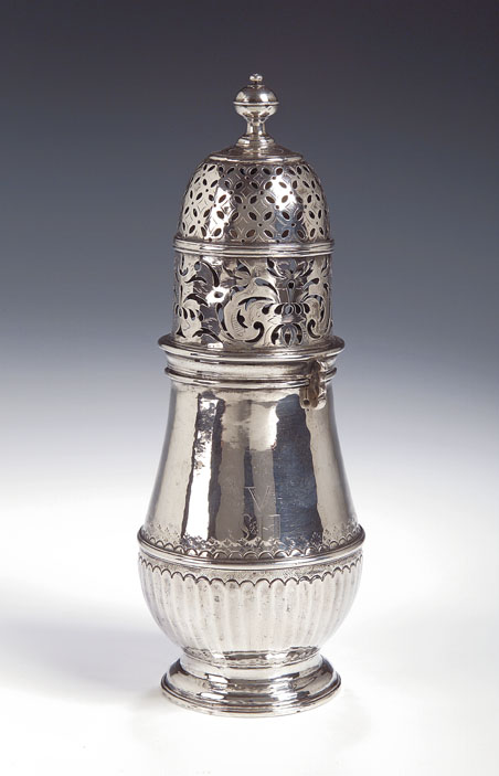 with marks for London, 1705, the pierced and scroll engraved domed top with ball finial, baluster body engraved with initials ‘VSH’, above gadrooning and circular spreading base
