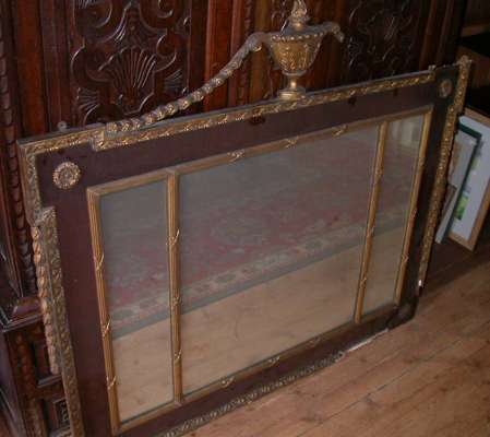 of George III style, the three rectangular mirror plates in gilt tied slip mouldings, surmounted by a flaming urn suspending harebell chains, in egg and dart moulded border (damages)