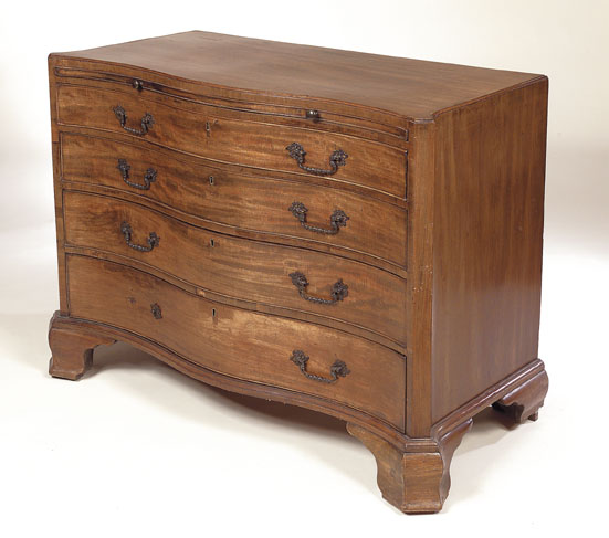 the moulded shaped top above a brushing slide and four long graduated drawers, on ogee bracket feet
