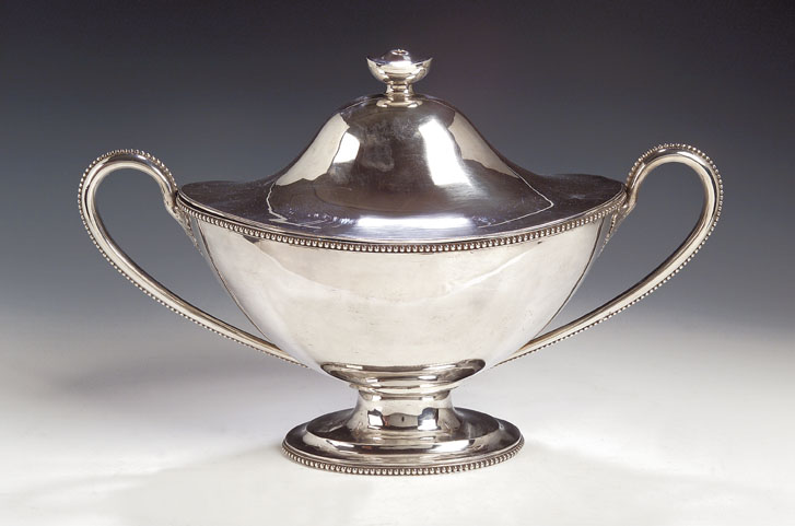 with marks for Paul Storr London, 1812, of oval form, the domed lid with boat finial, the base with ball cast rim and two similar scrolling handles, on spreading oval foot with ball cast edge