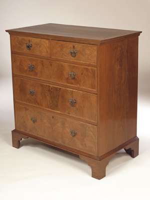 of early 18th century style, the rectangular crossbanded top above two short and three long graduated drawers, on bracket feet