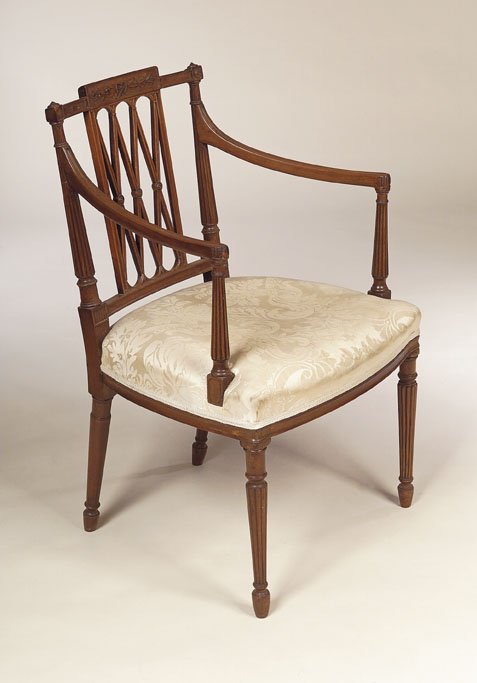 with ribbon and husk carved tablet top rail, above a pierced lattice back, the upholstered seat on reeded tapering legs and toupie feet