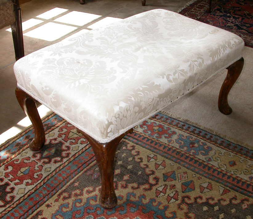 the cream damask upholstered rectangular top, on cabriole legs with pad feet