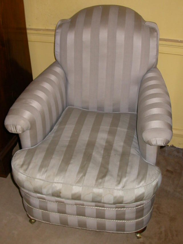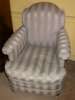 covered in grey striped fabric, with arched back, scrolled arms and loose cushion, on bun feet