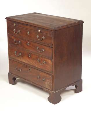the moulded rectangular top above a baize lined brushing slide and four long graduated drawers, on bracket feet,