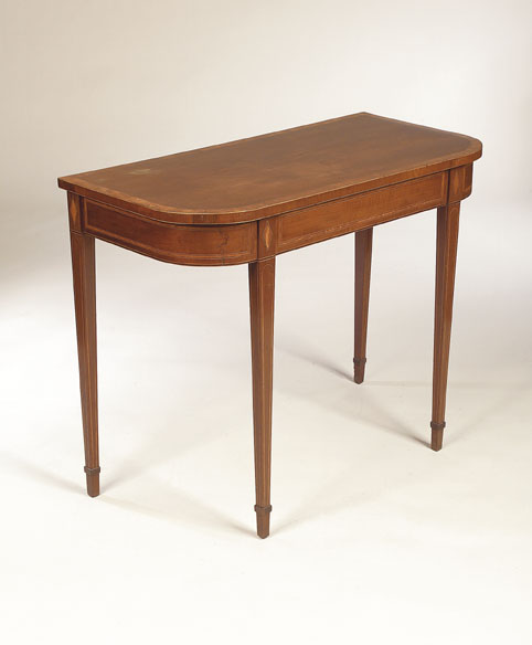 the satinwood crossbanded rounded rectangular top above a line inlaid frieze, on line inlaid square tapering legs with collared feet, adapted