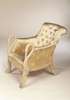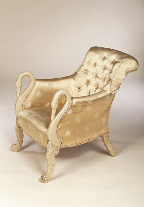 of Russian style, upholstered in lemon damask, with outscrolled button upholstered back, arms with scrolled swan-carved terminals, on scrolled feet