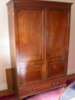 the moulded and dentil inlaid cornice above a plain frieze and two line inlaid panelled cupboard doors, enclosing an interior with hooks and rail, above a long drawer, on splayed bracket feet
