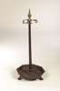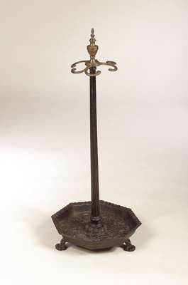 W Bullock & Co, with brass urn finial and scrolled hooks above reeded column and octagonal drip tray, on paw feet, cast mark to base