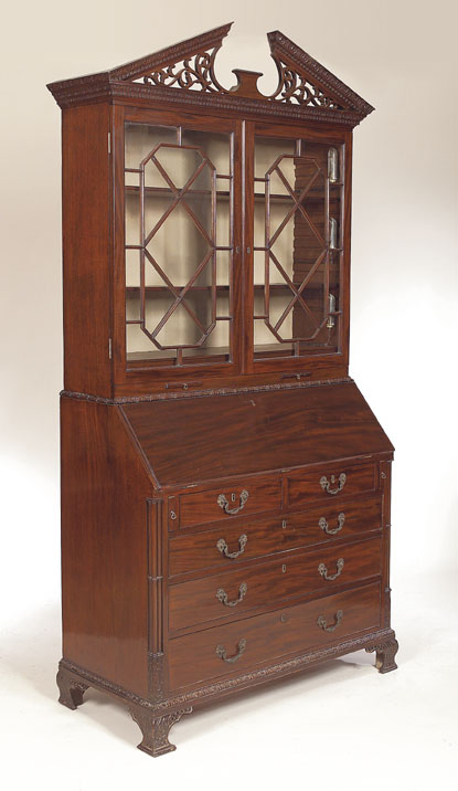 of early George III style, the broken pediment with leaf and dentil moulding and pierced scrolling spandrels, above two astragal glazed doors enclosing adjustable shelves, the hinged fall front enclosing fitted interior, above two short and three long graduated drawers, flanked by cluster columns, on leaf carved ogee bracket feet