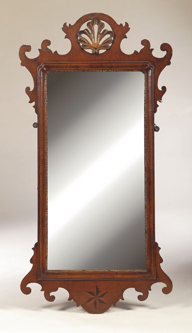 of Georgian style, the rectangular mirror plate with gilt slip, the fret carved scrolled frame with gilt shell surmount and inlaid star to the base