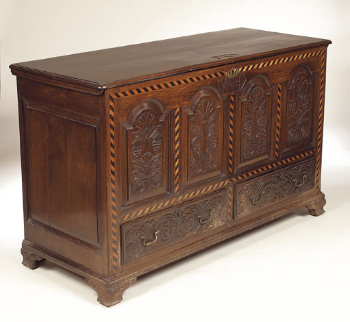 the hinged rectangular top above chevron line inlaid front with four arched foliate carved panels above two carved short drawers, on ogee bracket feet, carved ‘WH 1716’