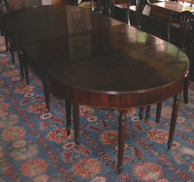 comprising: two D-ends, two central sections and three additional leaves, on ring turned tapering legs, the ends with brass caps and castors