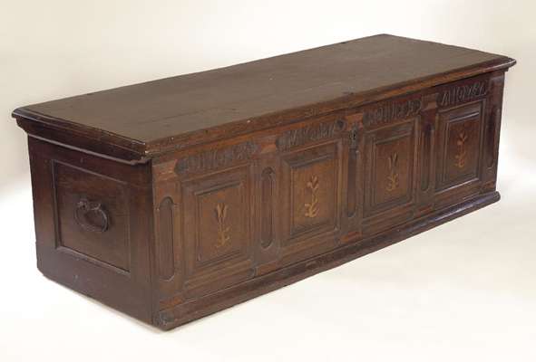 the hinged rectangular top above a front with four floral inlaid panels and carved ‘Junger Margreta Schults Ano 1757’, on moulded base